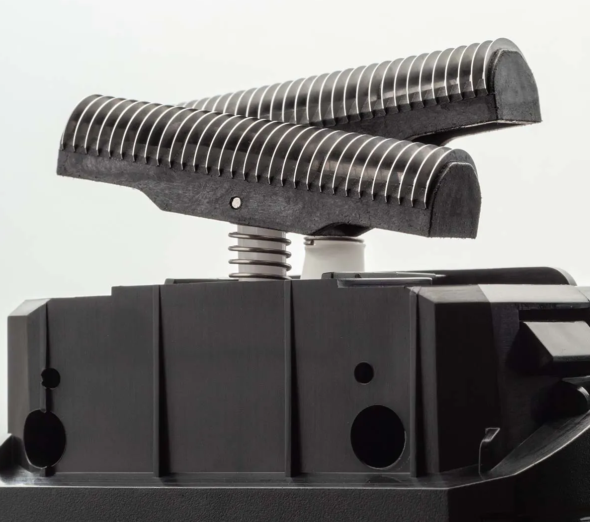 - Sistema de corte con suspensión individual que permite que las barras de corte se muevan de forma independiente, adaptándose a los contornos del cuello y el rostro para garantizar que todo el vello se elimina de forma suave y eficaz.